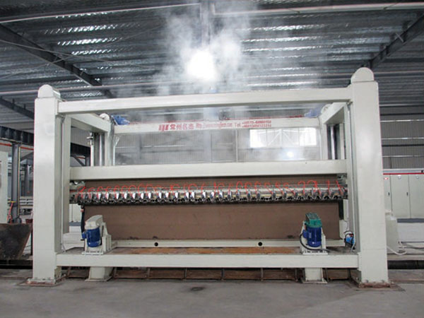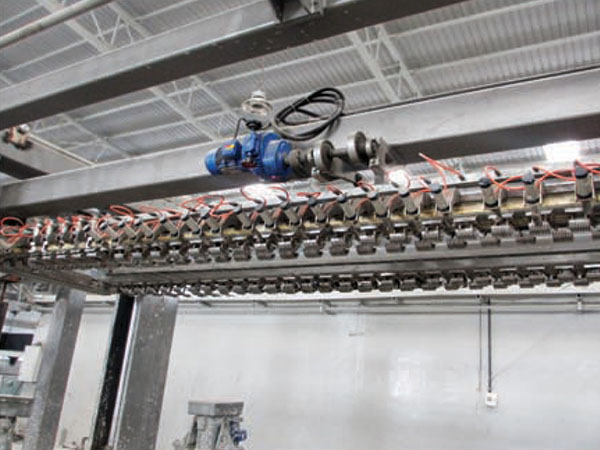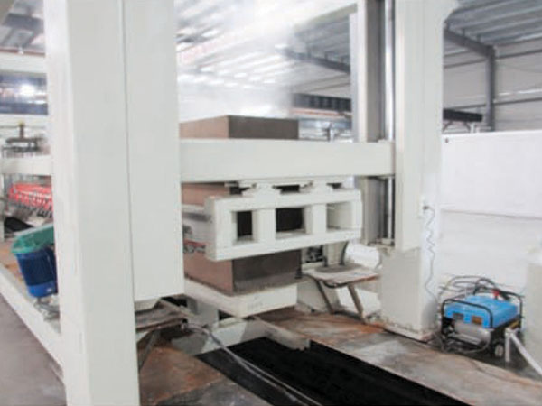 當澆注預養(yǎng)好的模坯在空中翻轉(zhuǎn)90°吊至切割小車,脫去??蚝螅梢徊壳懈钚≤囕d運至縱切機、橫切機工位對坯體進行六面切割。首由縱切機對坯體進行縱向、水平四面切割,完成后由切割車載運坯體停留在橫切機工位,完成后經(jīng)液壓升裝置上升抬起胚體,一部切割小車退回初始位置準備運載下一模胚體,以備切割。二部切割小車行至橫切機位置,液壓升裝置下降將坯體放至二部切割小車上,然后由橫切機對坯體進行垂直切割,切割完成后仍由二部切割車運載坯體運行至半成品吊具下方,由半成品吊具將坯體吊到蒸養(yǎng)車上做預編組。切割周期約4. 5min.