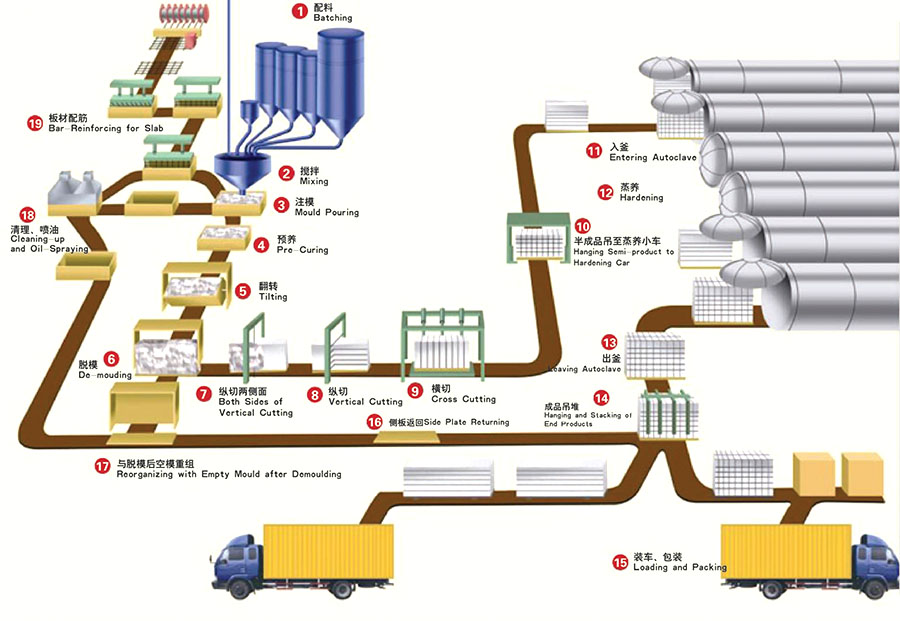 首先將儲存的原材料計算配料(1)后進(jìn)入澆筑攪拌機(jī)內(nèi),經(jīng)攪拌(2)均勻后澆注(3)在模具內(nèi), (板材配筋(19) ),經(jīng)過一定溫度個時間的預(yù)養(yǎng)(4) 坯體達(dá)到一定厚度后,由翻轉(zhuǎn)吊具下列功能: A把模具在空中做90度翻轉(zhuǎn) (5)模具的一側(cè)板成為支撐坯體的底板直至蒸養(yǎng)出成品,B吊至小車或切割支撐架_上完成開模、 脫模(6) C脫^下的模框和返回的蒸養(yǎng)側(cè)板(16)再重新組合成模具 (17)等待清理后噴油(18) 重新澆注。坯體在切割機(jī).上分布做六面切割:A首行坯體兩側(cè)面垂直切割 (7) B然后進(jìn)行縱向水平式切割(8) ,C后進(jìn)行橫向垂直鍘刀式切割(9)。切割好的坯體由半成品吊具連同底板吊至蒸養(yǎng)小車(10) 然后編組入蒸壓釜(11) 進(jìn)行高溫蒸養(yǎng)(12) 蒸養(yǎng)出釜(13),由成品吊具將成品堆垛(14) 或裝車、 打包(15),蒸養(yǎng)側(cè)板則返回 (16)